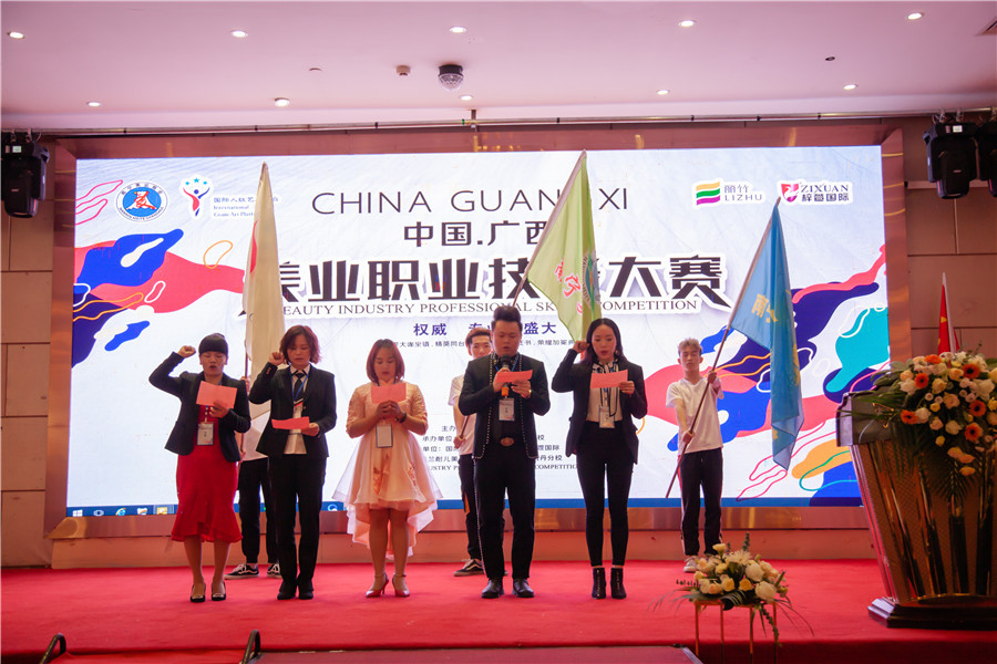 評委代表上臺宣誓:李遂中(美發(fā)評委)、黃海紅(紋繡評委)、吳艷陽(美甲評委)、蘇貴霞(化妝評委)、陸玉清( 美容評委)