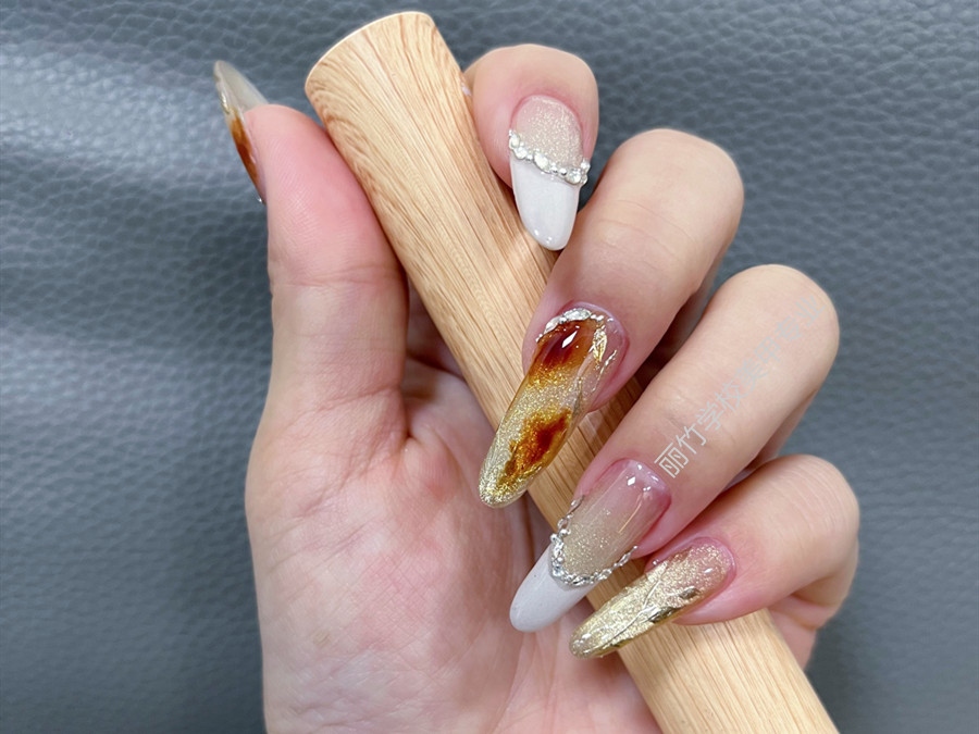 廣西美甲訓(xùn)練、廣西美甲職業(yè)教育:作品主要以貓眼膠作為主題繪制。以棕色暈染起到點睛之筆的作用,然后在指尖勾畫出法式風(fēng)格的微笑弧線,然后用白色彩繪膠進(jìn)行填充,之后在粘貼碎鉆進(jìn)行裝飾,使得整副美甲作品變得更加高雅和精致。