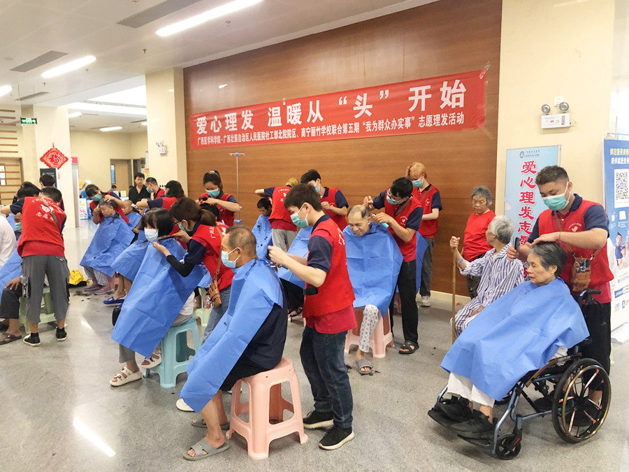 廣西美發(fā)學(xué)校愛心義剪、廣西美發(fā)學(xué)校醫(yī)院公益活動:7月28日,中共麗竹學(xué)校學(xué)校支部志愿者服務(wù)隊(duì)(廣西美發(fā)培訓(xùn)班)主動申請參加廣西學(xué)科學(xué)院·廣西壯族自治區(qū)人們醫(yī)院社工部北院院區(qū)共同組織的第五期“我為群眾辦實(shí)事”系列---愛心理發(fā),溫暖從“頭”開始為主題的志愿者理發(fā)活動。