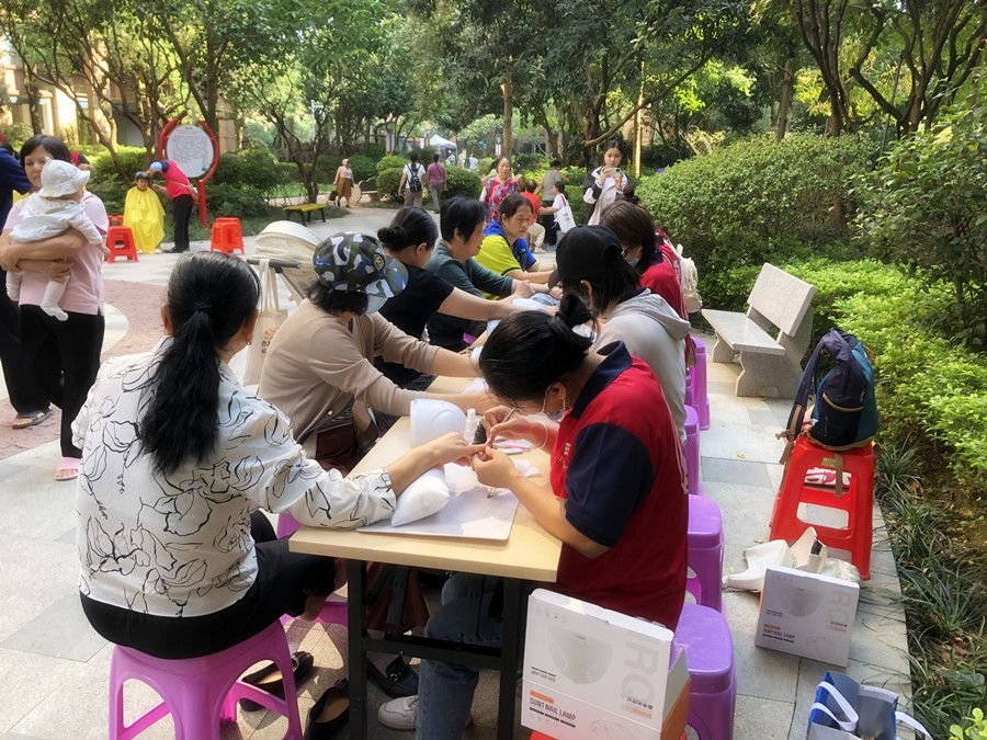 因?yàn)閳龅赜邢蓿m然在現(xiàn)場只為大家進(jìn)行了基礎(chǔ)的修手,去死皮,打磨甲型,進(jìn)行手部護(hù)理,還有涂抹單色和進(jìn)行簡單的暈染款美甲,但居民們還是給我們的美甲志愿者打出高分之余,并對她們的專業(yè)性表示了肯定。