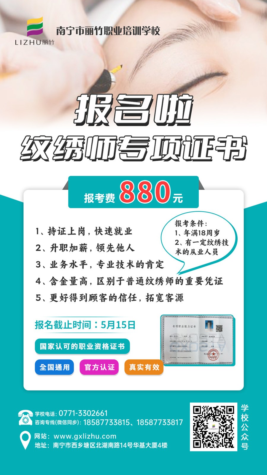 南寧美容師職業(yè)資格證書考試、南寧紋繡師專項證:注意啦!注意啦!在近期有想南寧考美容師證,或是想知道南寧哪里可以考紋繡師證的小伙伴們,南寧美業(yè)職業(yè)培訓(xùn)學(xué)校-麗竹學(xué)??甲C班5月份報名活動正在火熱進行中,學(xué)位滿額即截止報名,所以請務(wù)必好好看看清以下海報的內(nèi)容信息哦!