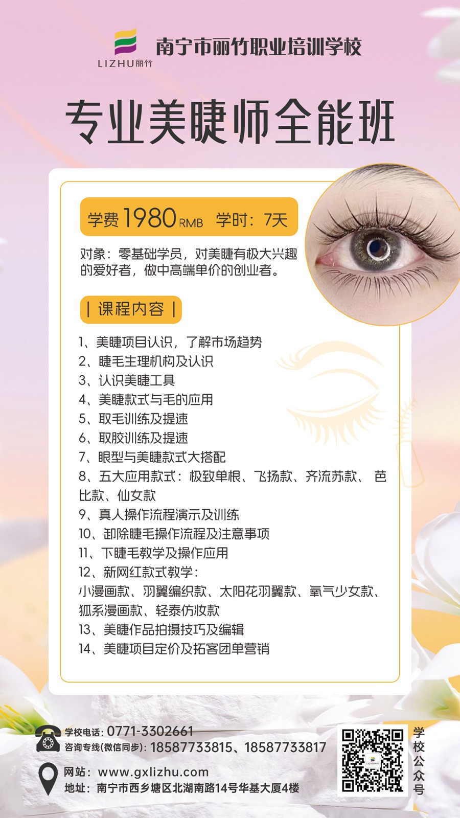 南寧美睫師、零基礎(chǔ)學美睫:寧美睫培訓學校-麗竹學校美睫課程教學技術(shù)成功全面升級!美睫學費優(yōu)惠活動持續(xù)進行,截止日期為5月30日。如果你想在南寧學美睫,想做南寧美睫培訓學費哪里便宜?那現(xiàn)在就不要猶豫,趕緊聯(lián)系我們報名吧!拼手速的時候就是現(xiàn)在。畢竟,你還在猶豫不決時,別人已經(jīng)開始行動了。